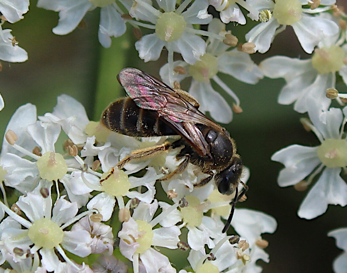 Personal records: I have recorded this species widely in Cos. Down, Antrim, Wicklow, Carlow, Armagh and Roscommon. Females are more conspicuous earlier in the year and are often found on composite flowers, whilst the males can be common in late summer, often on thistles, knapweeds and Ragwort. Nests are constructed in a wide variety of settings, such as clay and sandy banks, gravelly slopes and soft-rock cliffs, often in aggregations. It is one of the hosts of Sphecodes monilicornis and a possible host of S. ephippius.