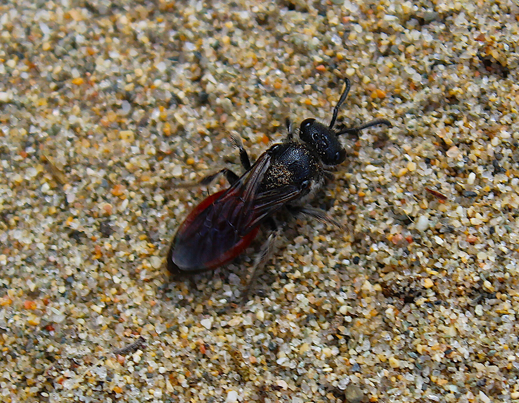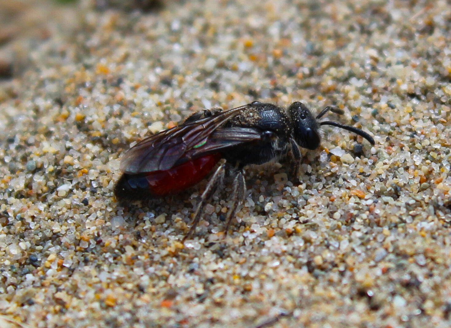 This is one of Ireland’s rarest bees, being confined to a single location where it has only been recorded on a small number of occasions. Compared to its relatives it is a medium-sized blood bee (7-9mm) with a rather compact body and transverse head. The best means of identifying the females is to check for the presence of a sharp angular collar just behind the head, so a specimen will be needed. Males are best determined using genitalia. It inhabits sites occupied by its host species, Andrena barbilabris.
