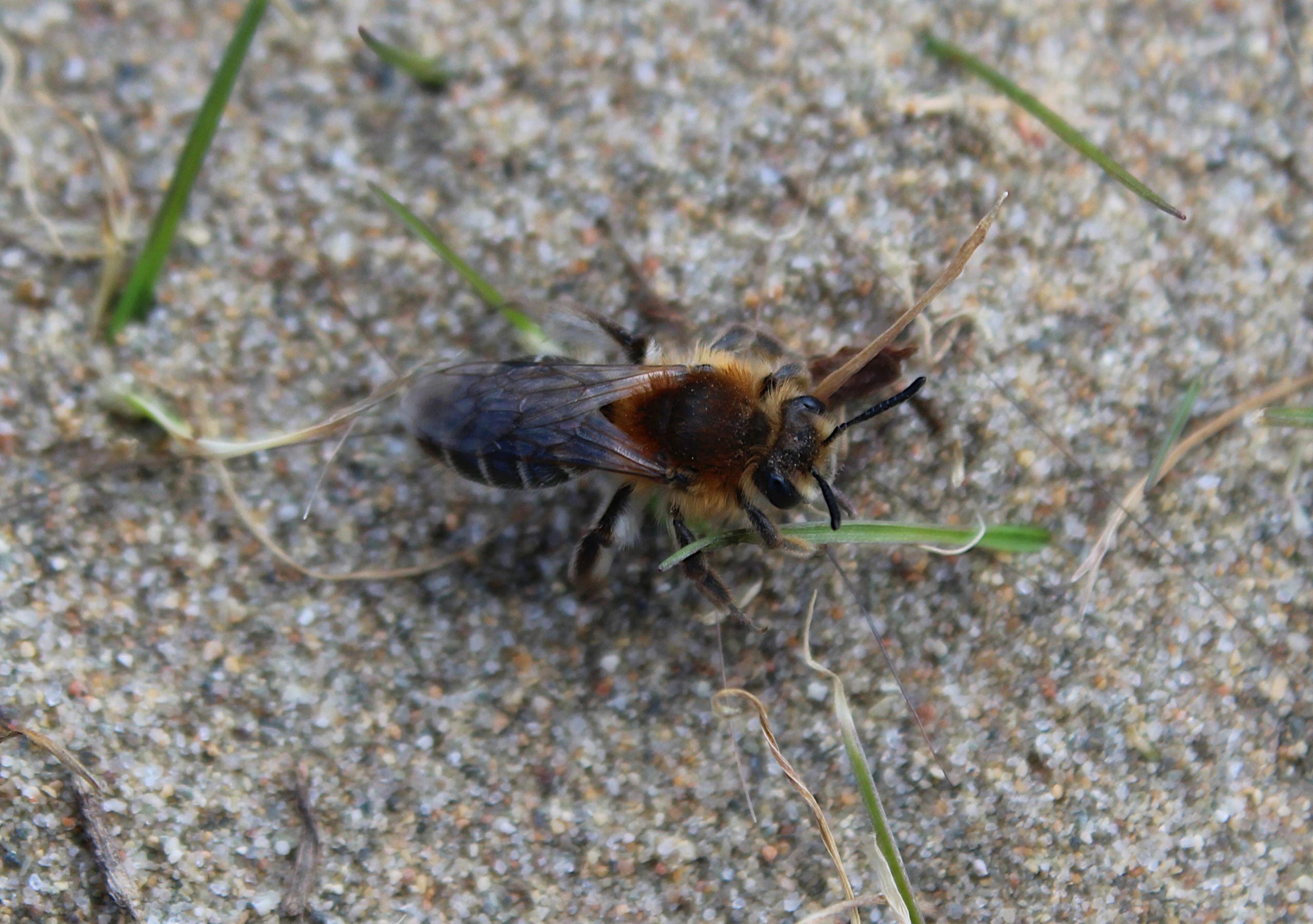 This bee is well named as it has a strong association with sandy habitats, where the females often nest in dense aggregations. I have observed females flying in short zig-zags over patches of bare sandy before landing and promptly burrowing beneath the surface, only to emerge a minute or so later. Females are quite easy to identify as they are the only spring-flying species with a reddish-brown thoracic pile, dense pale hairs on the head and sides of the thorax and an abdomen with narrow white bands. Males are smaller with greyish hairs. It measures 11-13mm in length and is listed as Near Threatened, largely due to destruction of coastal habitats and development of sandy brownfield sites inland.