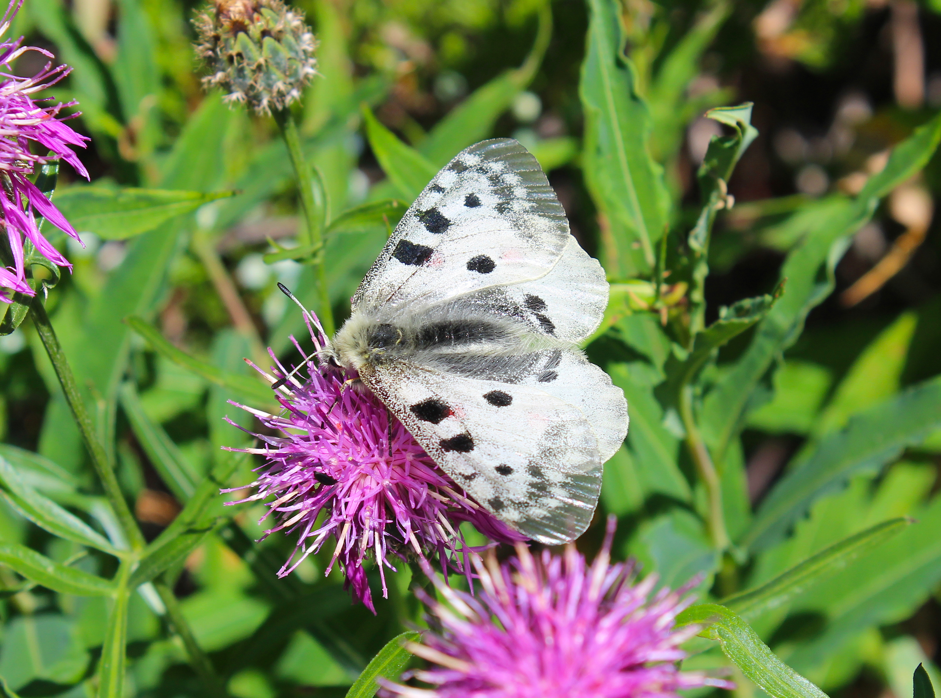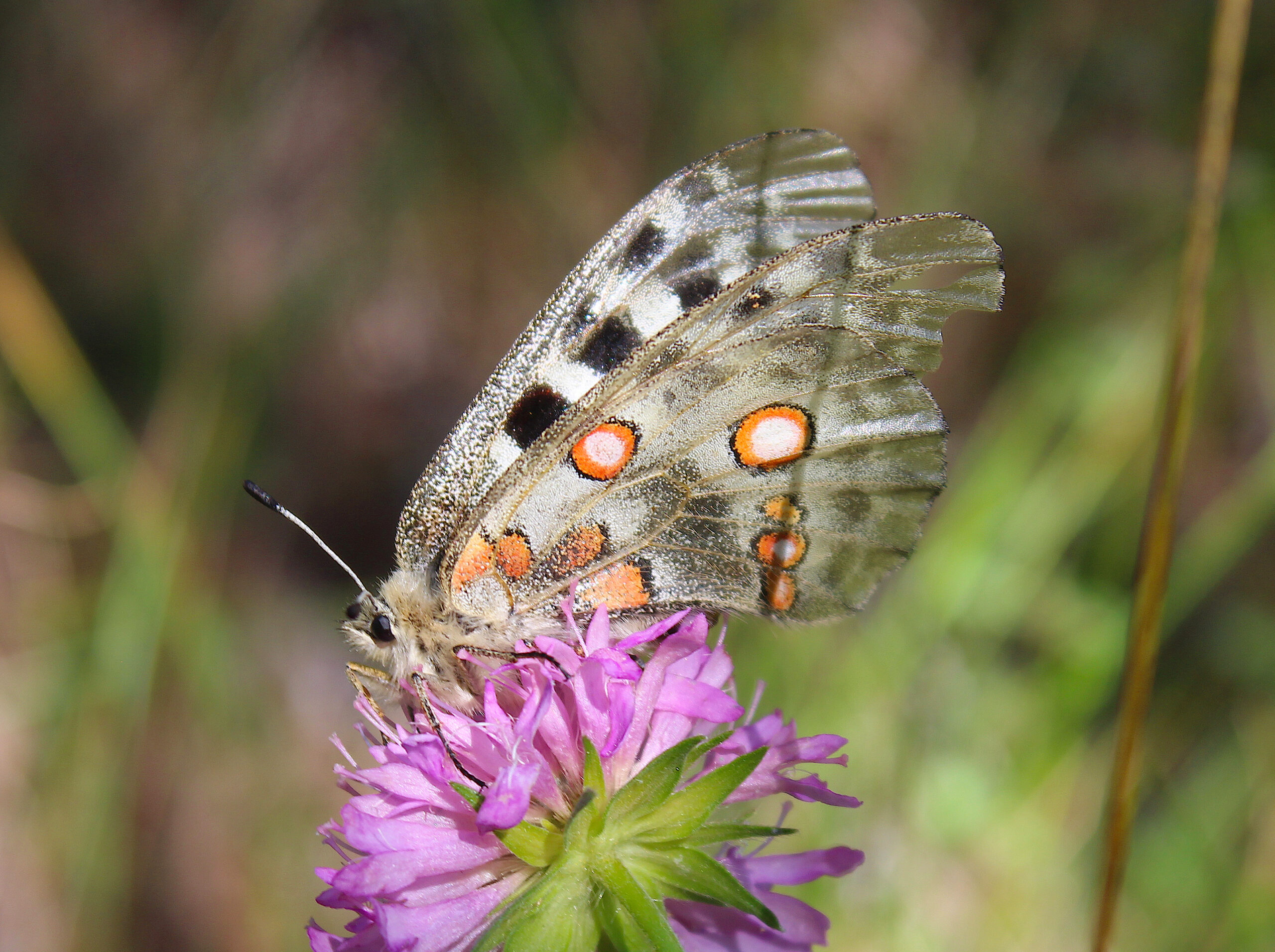A stunning mountain butterfly, this species is possibly my favourite. Its striking colouration and grandeur give it instant appeal and interestingly it is one of the only species in Europe with an audible flight; its wings sometimes sounding like two pieces of tissue paper during flight. There are several distinctive forms found across Europe, with specimens from the Balkans possessing rich red spots whereas those from Spanish mountain ranges have orange spots. It flies alongside the Small Apollo in the Alps but can be separated by its lack of red spots along the front margin of the forewing. It is a threatened species and receives protection in most European countries. Like some other Papilonids, it can be quite oblivious to people when it is feeding. It can also be fairly approachable whilst roosting, which is best observed in early morning or evening.