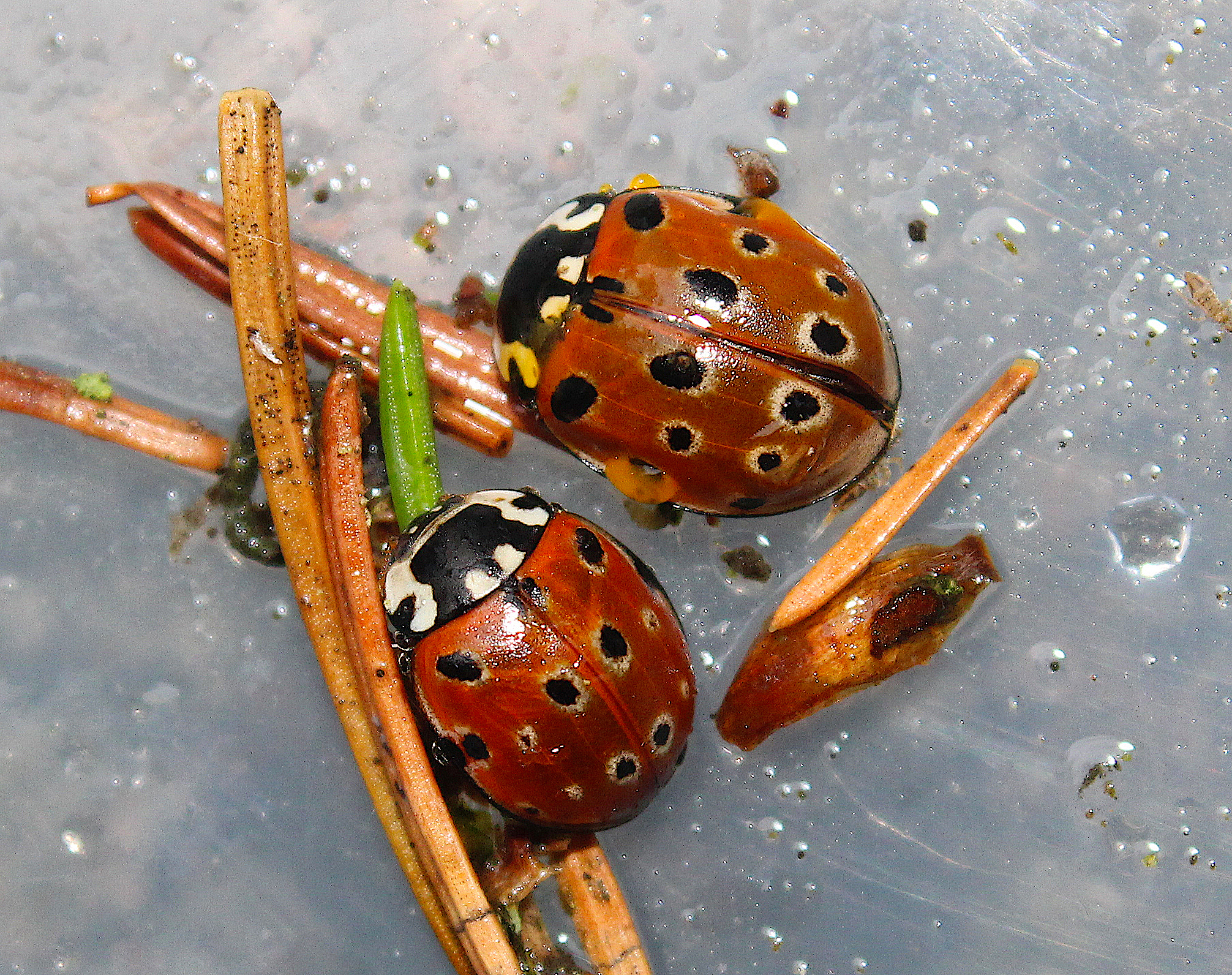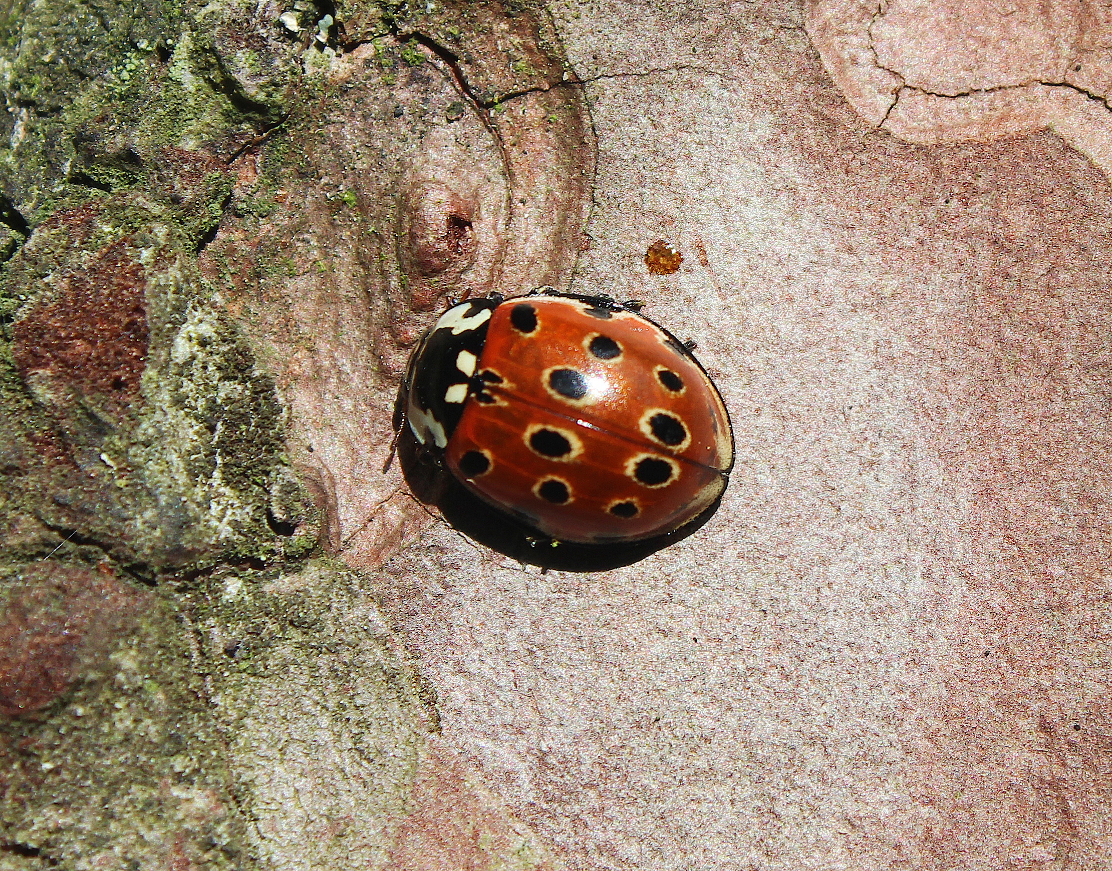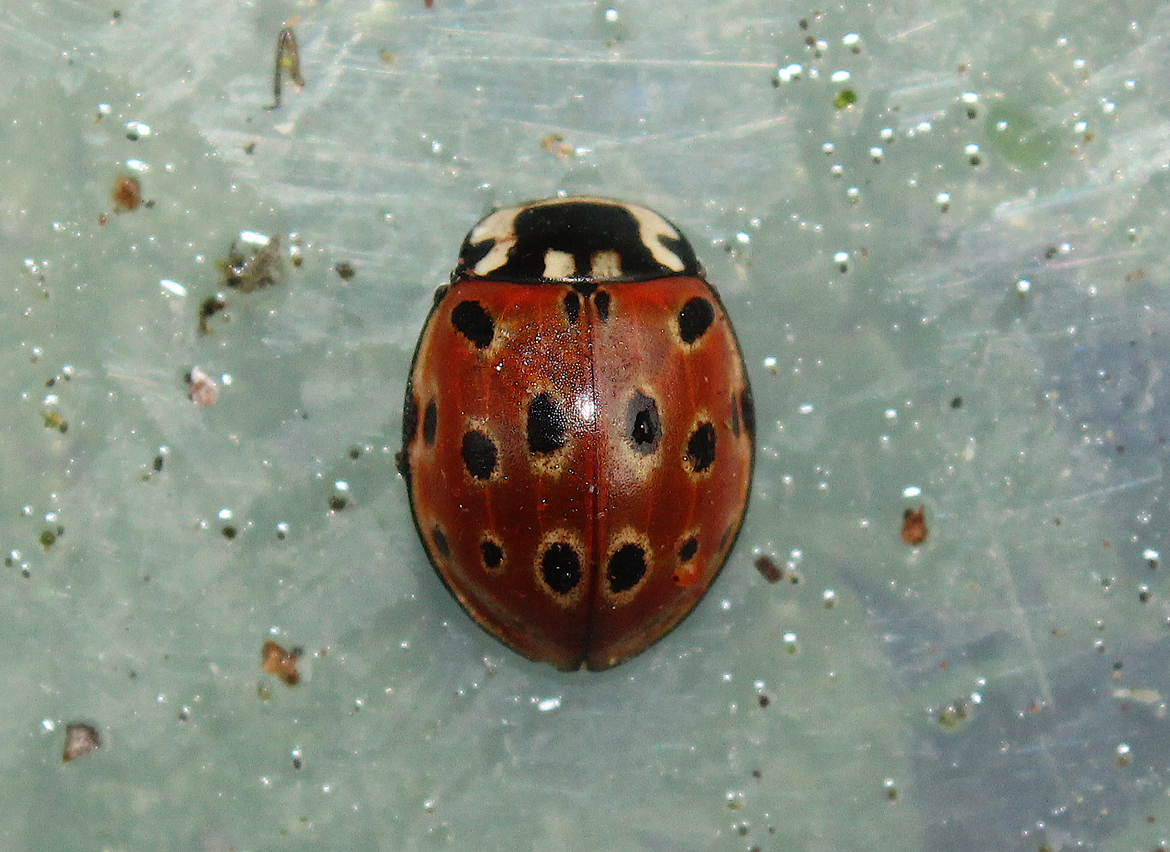 This is Ireland’s largest species, being only slightly larger than the Harlequin and Striped Ladybirds. It has a red-orange or red background colour with 16 black spots, often with yellowish rings giving the species its common name.
