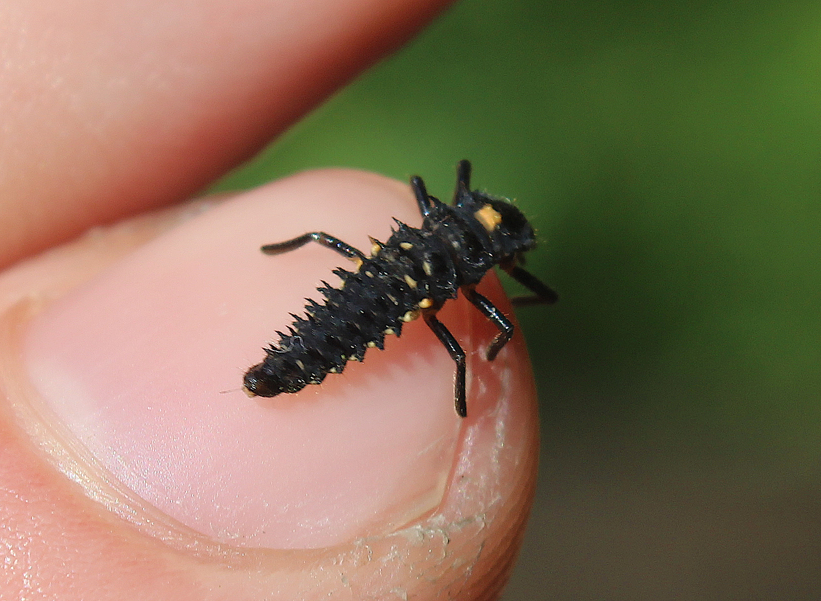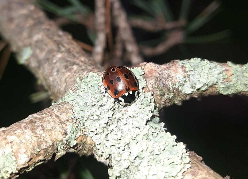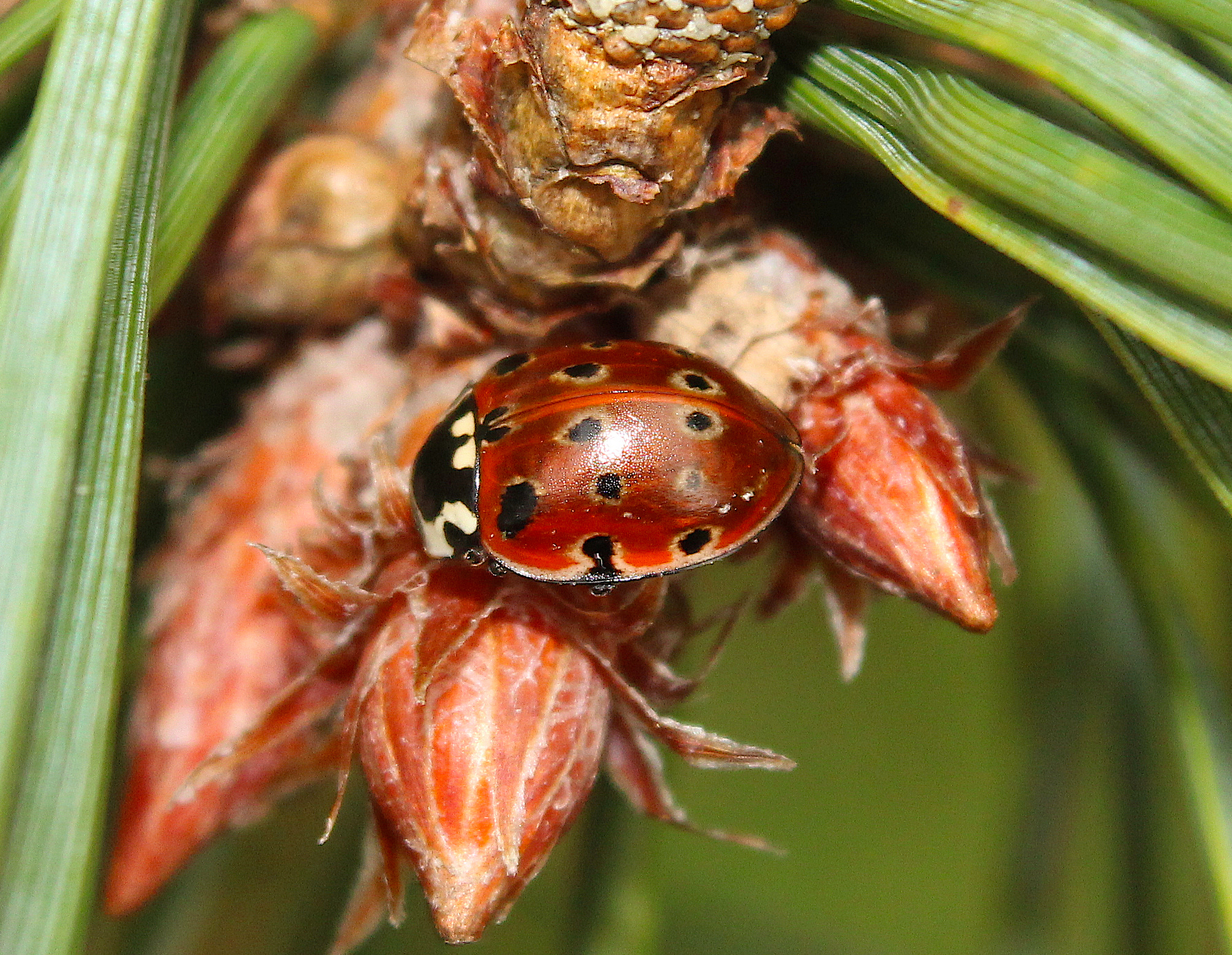 This is Ireland’s largest species, being only slightly larger than the Harlequin and Striped Ladybirds. It has a red-orange or red background colour with 16 black spots, often with yellowish rings giving the species its common name.