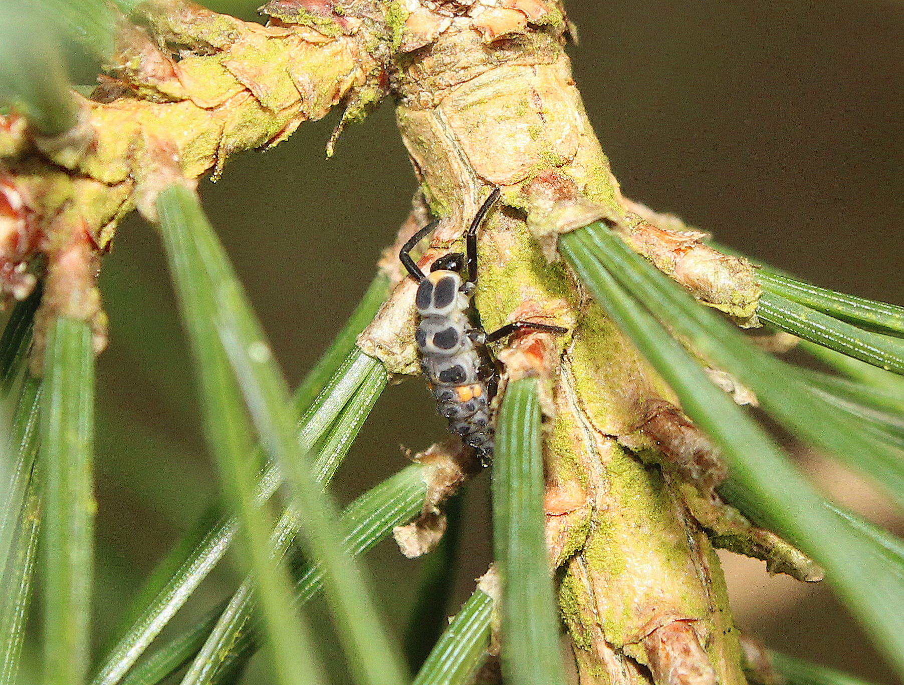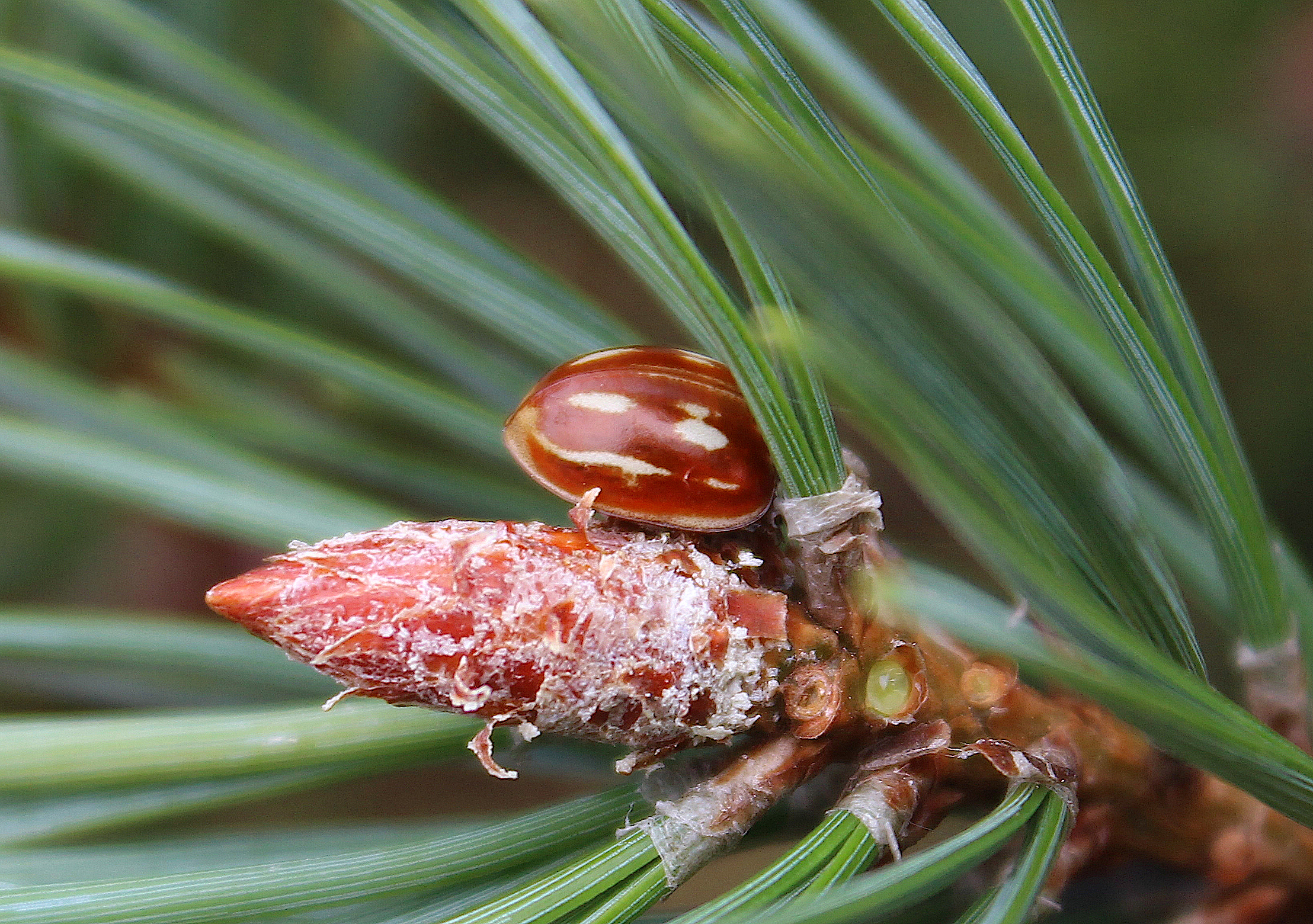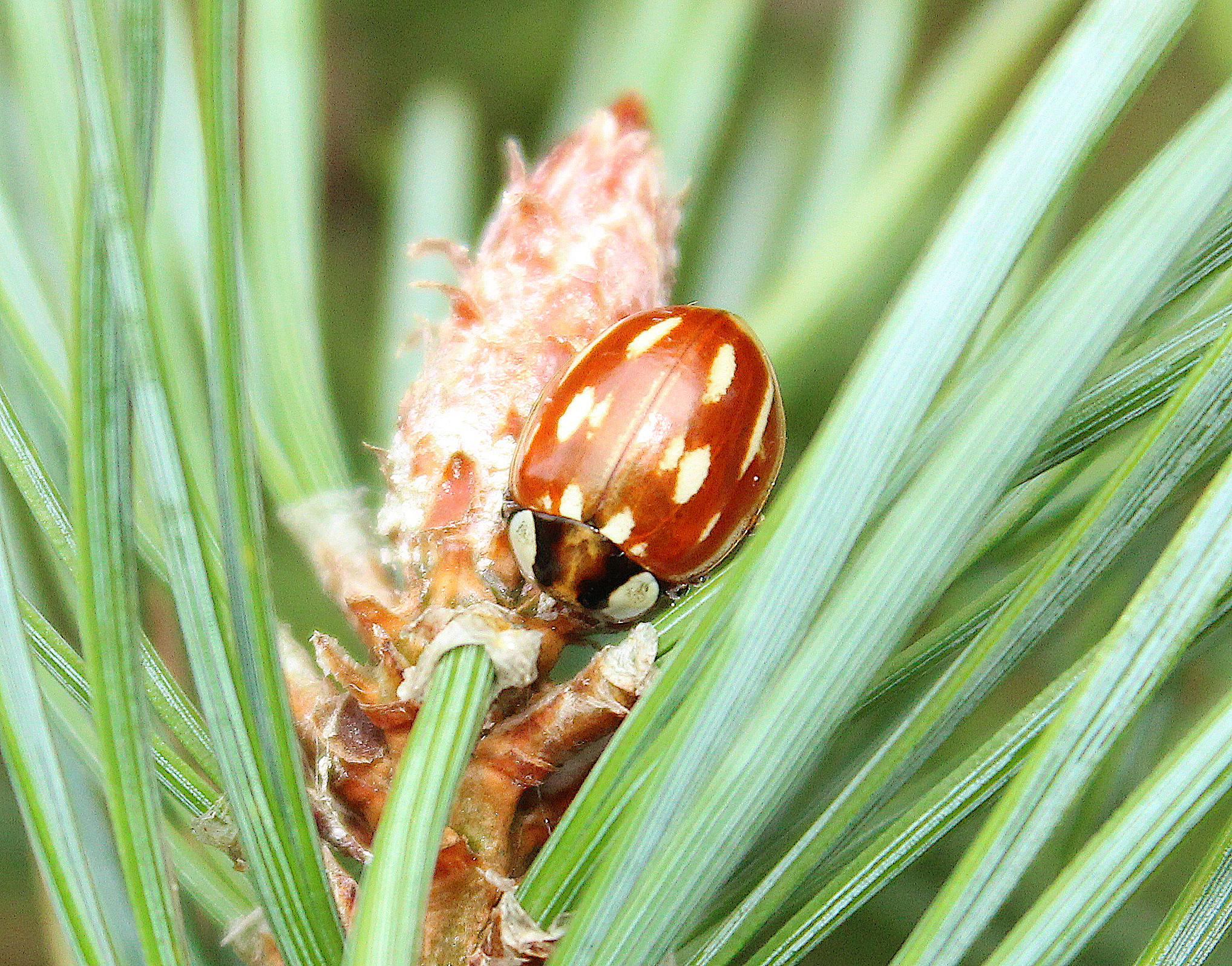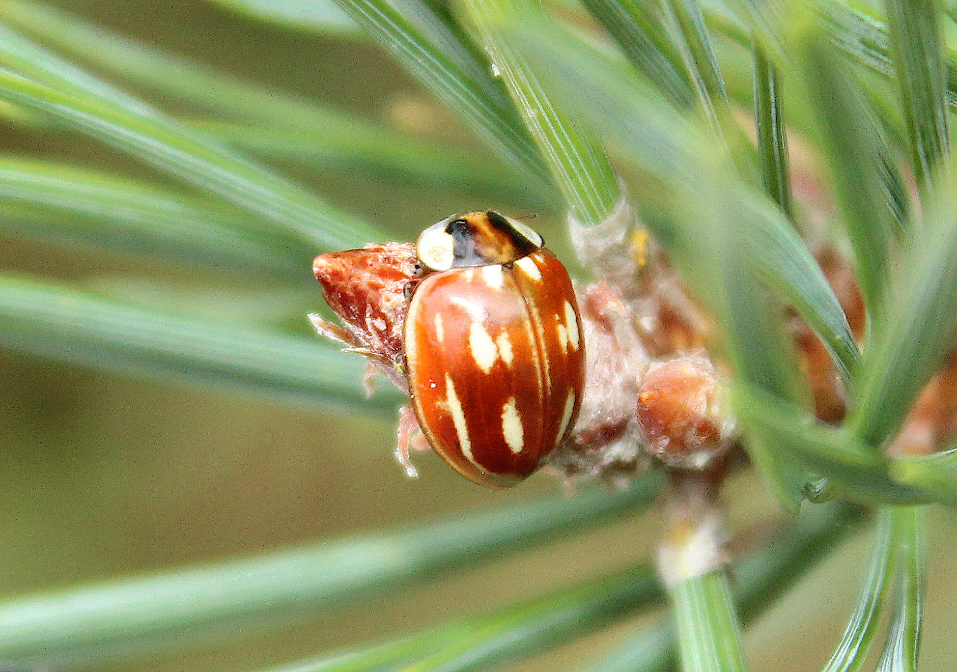Of all the conifer specialist ladybirds, this is one of the most elusive. It is a large, robust species with a light orange-brown background colour and several white streaks and spots which vary in their size, shape and intensity. Despite its size and colour, it can demonstrate remarkable camouflage among the buds of Scots Pine.