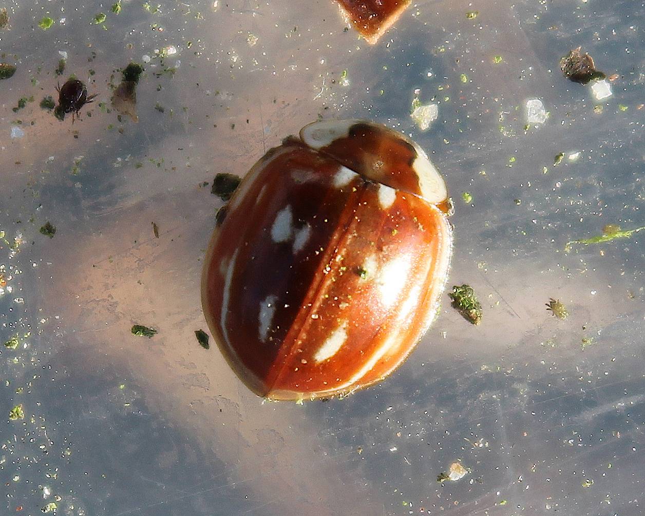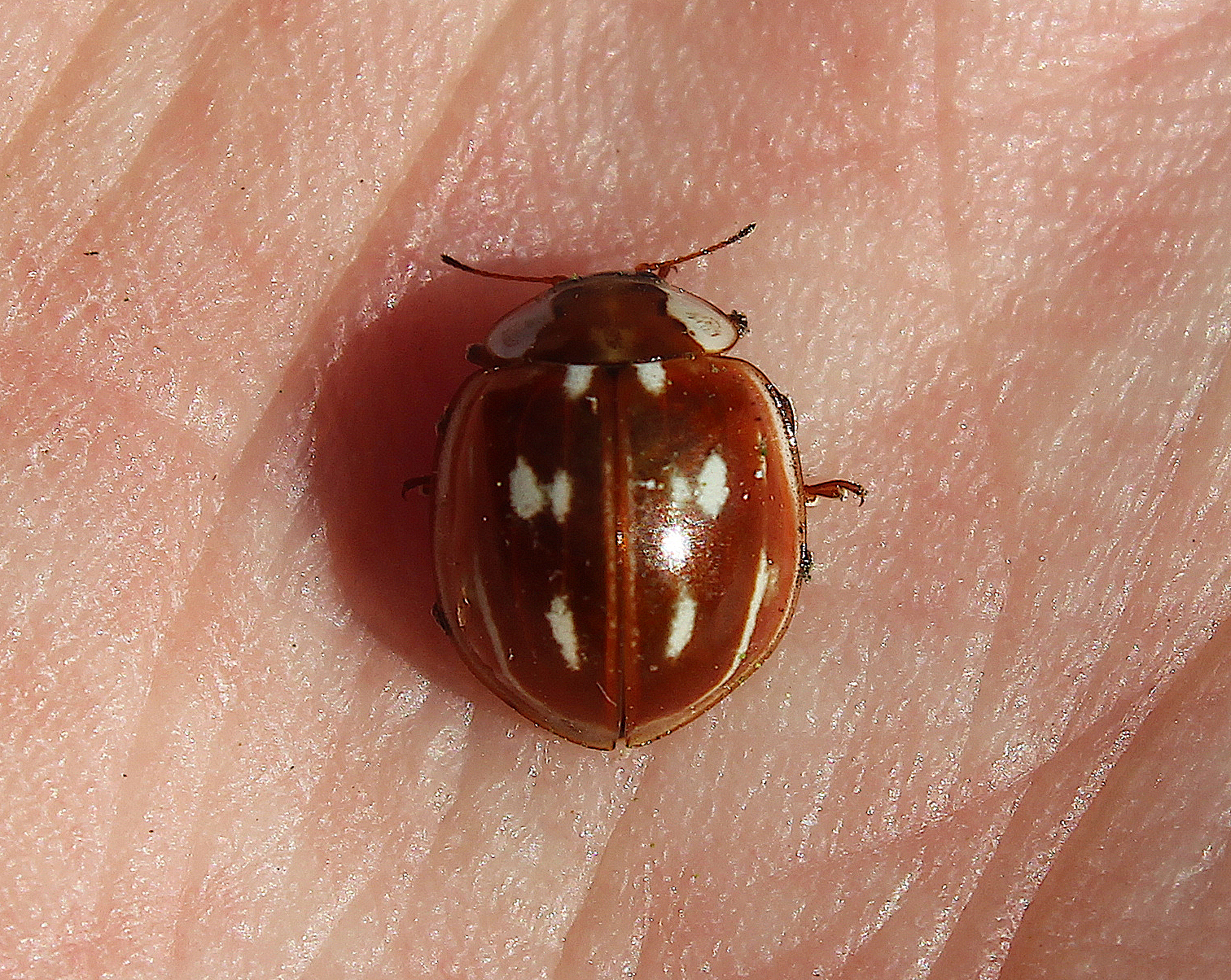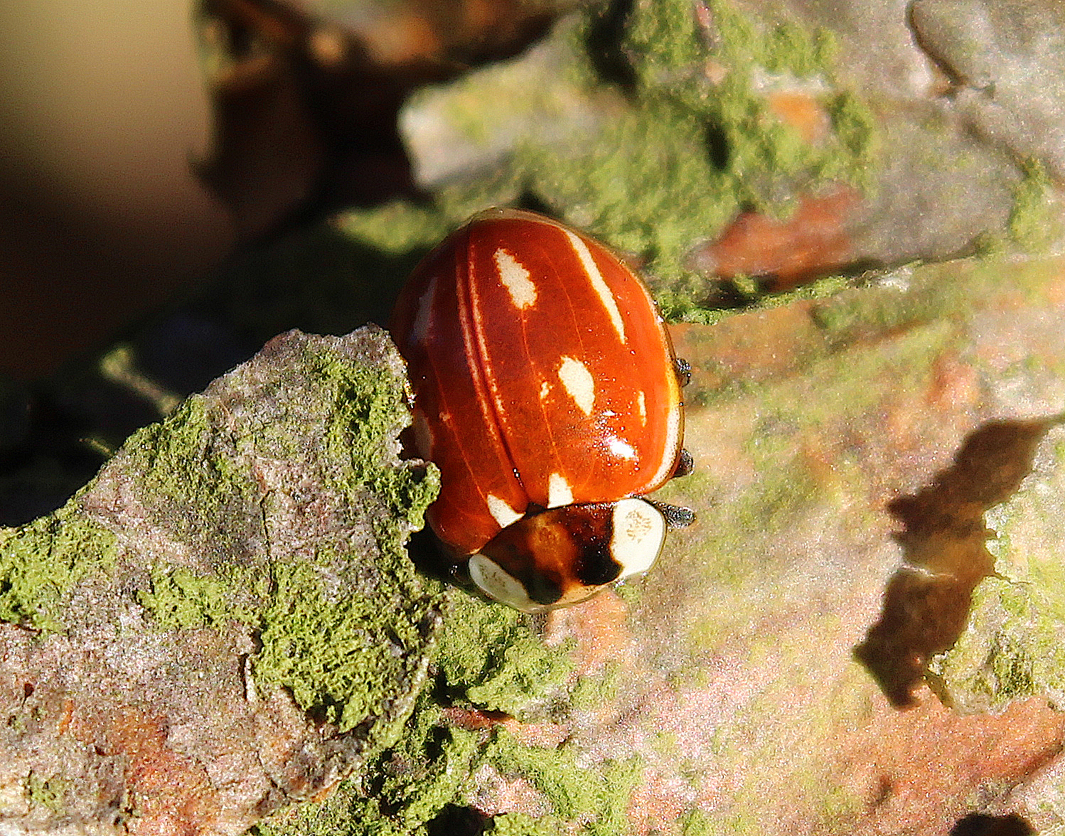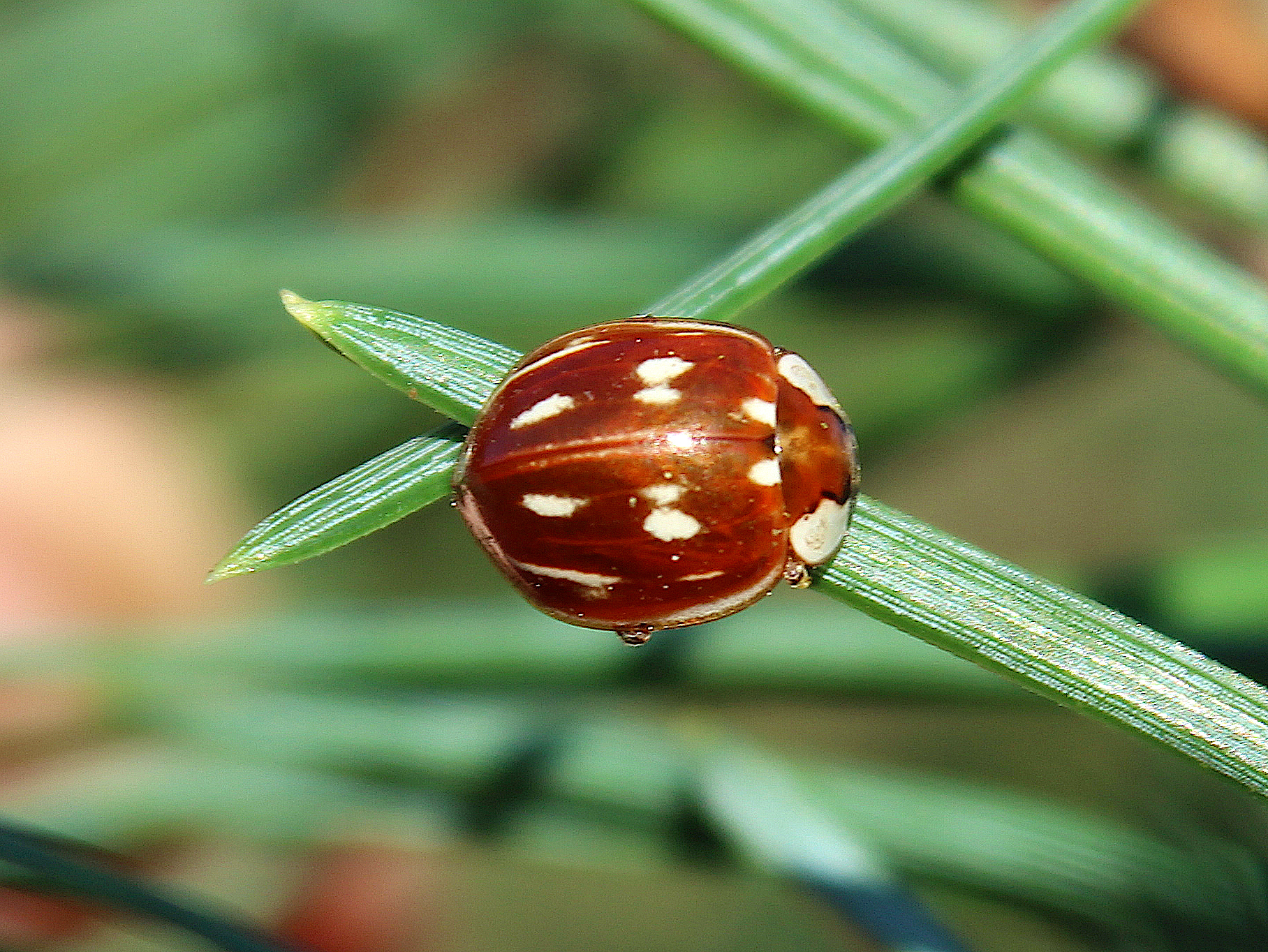 Of all the conifer specialist ladybirds, this is one of the most elusive. It is a large, robust species with a light orange-brown background colour and several white streaks and spots which vary in their size, shape and intensity. Despite its size and colour, it can demonstrate remarkable camouflage among the buds of Scots Pine.